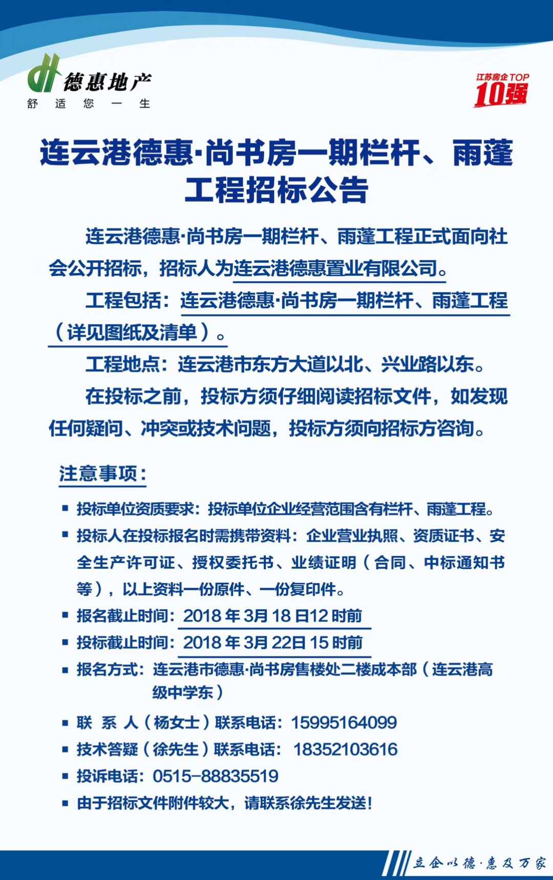 連云港德惠·尚書房一期欄桿、雨蓬工程招標(biāo)公告