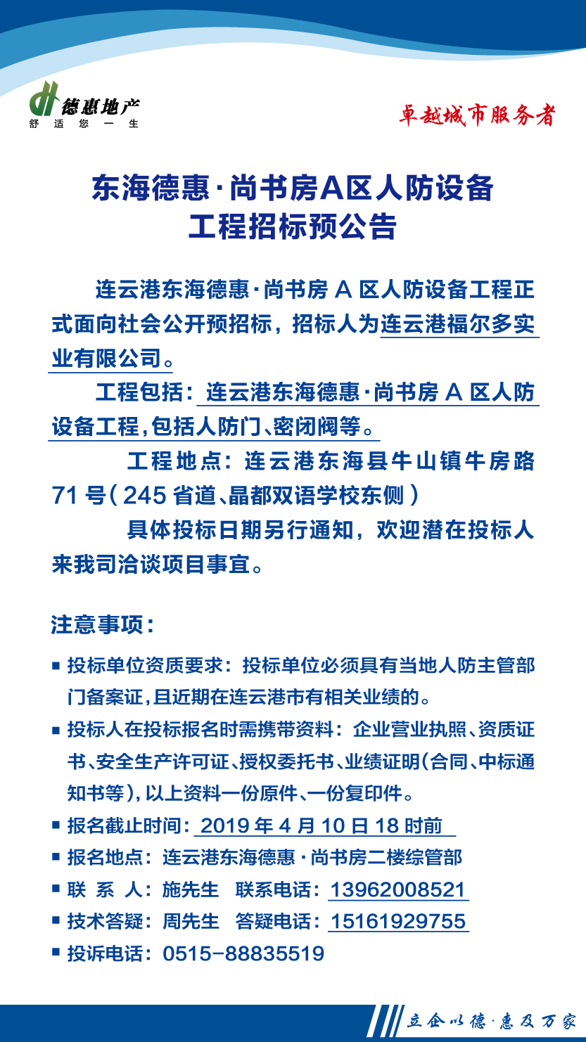 東海德惠·尚書房A區(qū)人防設(shè)備工程招標預(yù)公告