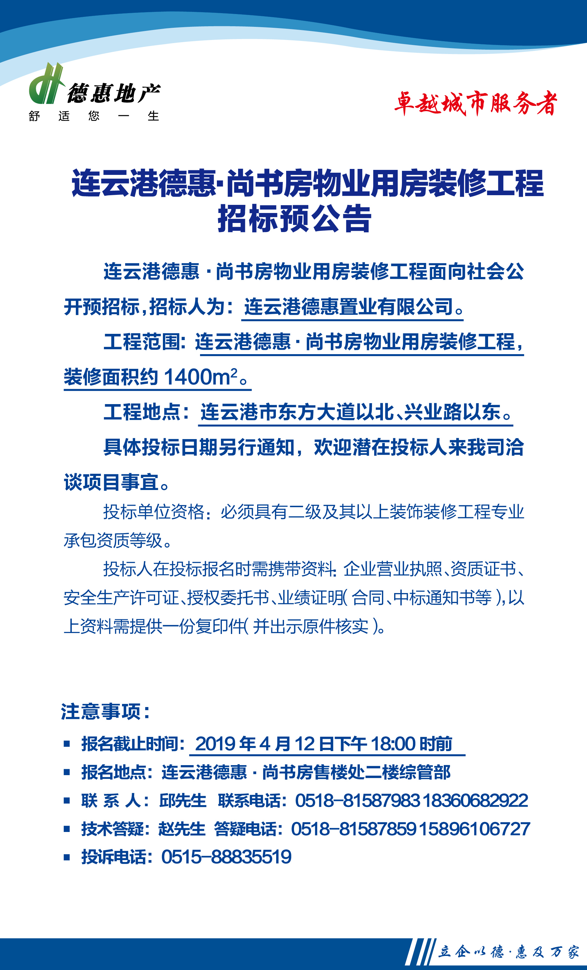 連云港德惠·尚書房物業(yè)用房裝修工程招標預公告