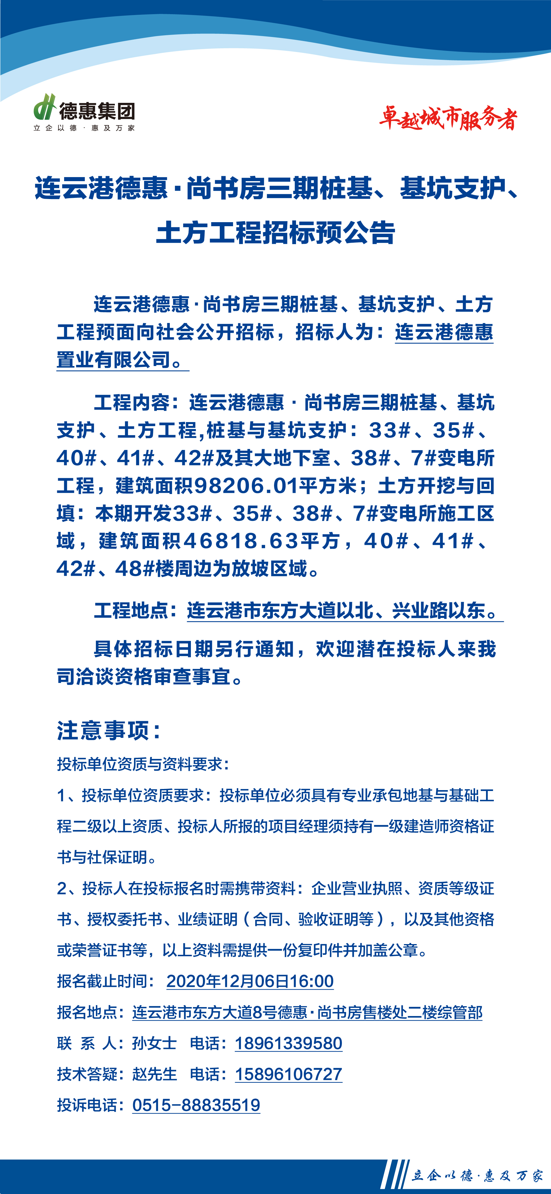 連云港德惠.尚書房三期樁基、基坑支護(hù)、土方工程招標(biāo)預(yù)公告