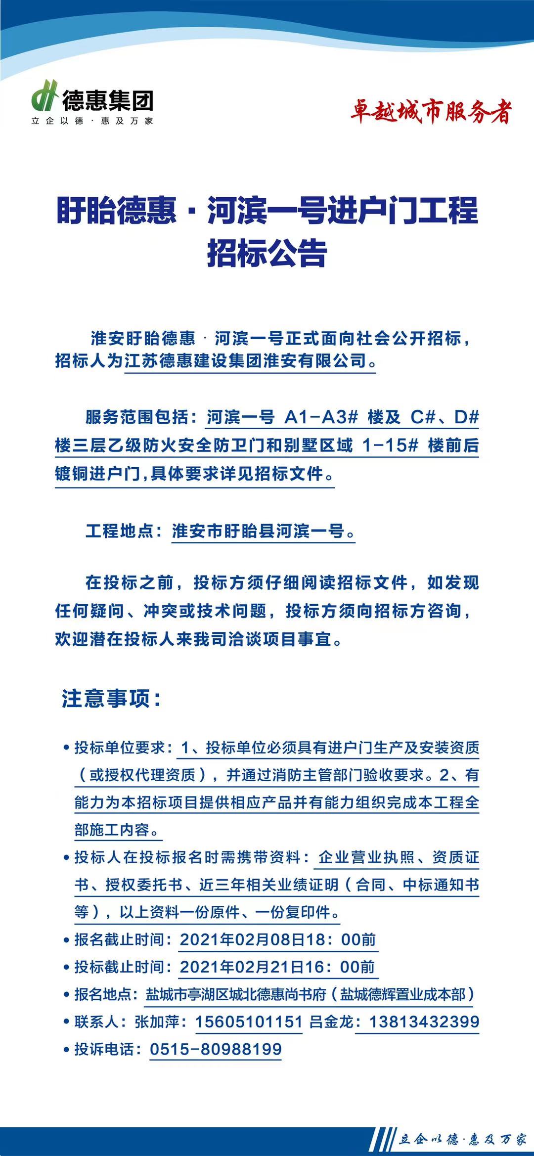 盱眙德惠·河濱一號(hào)進(jìn)戶門(mén)工程招標(biāo)公告