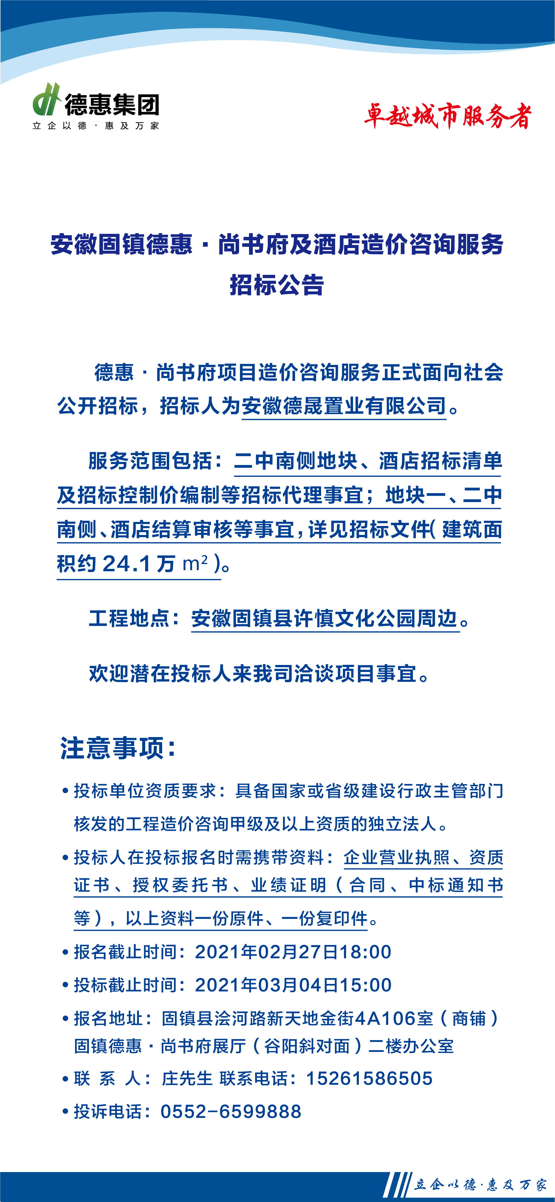 安徽固鎮(zhèn)德惠·尚書府及酒店造價咨詢服務招標公告