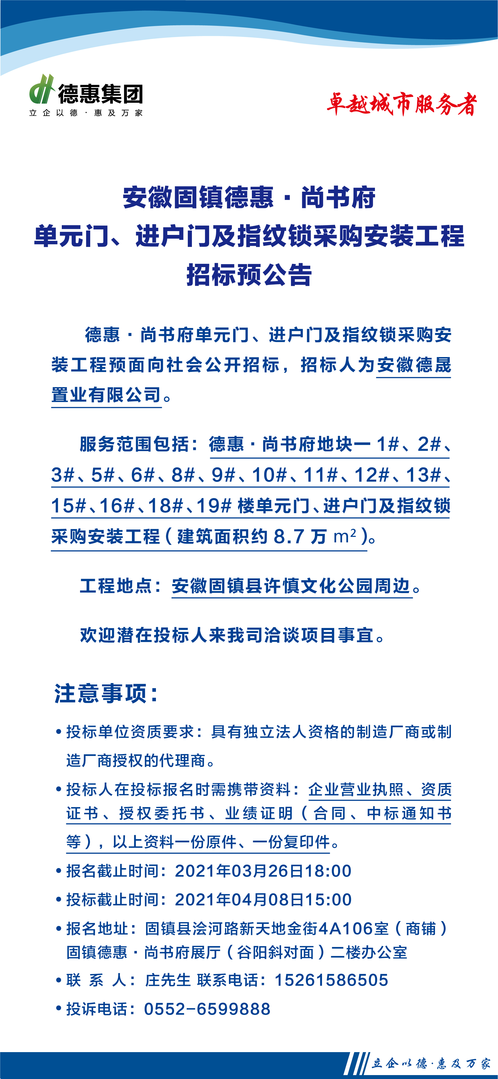 安徽固鎮(zhèn)德惠·尚書府單元門、進(jìn)戶門及指紋鎖工程招標(biāo)預(yù)公告