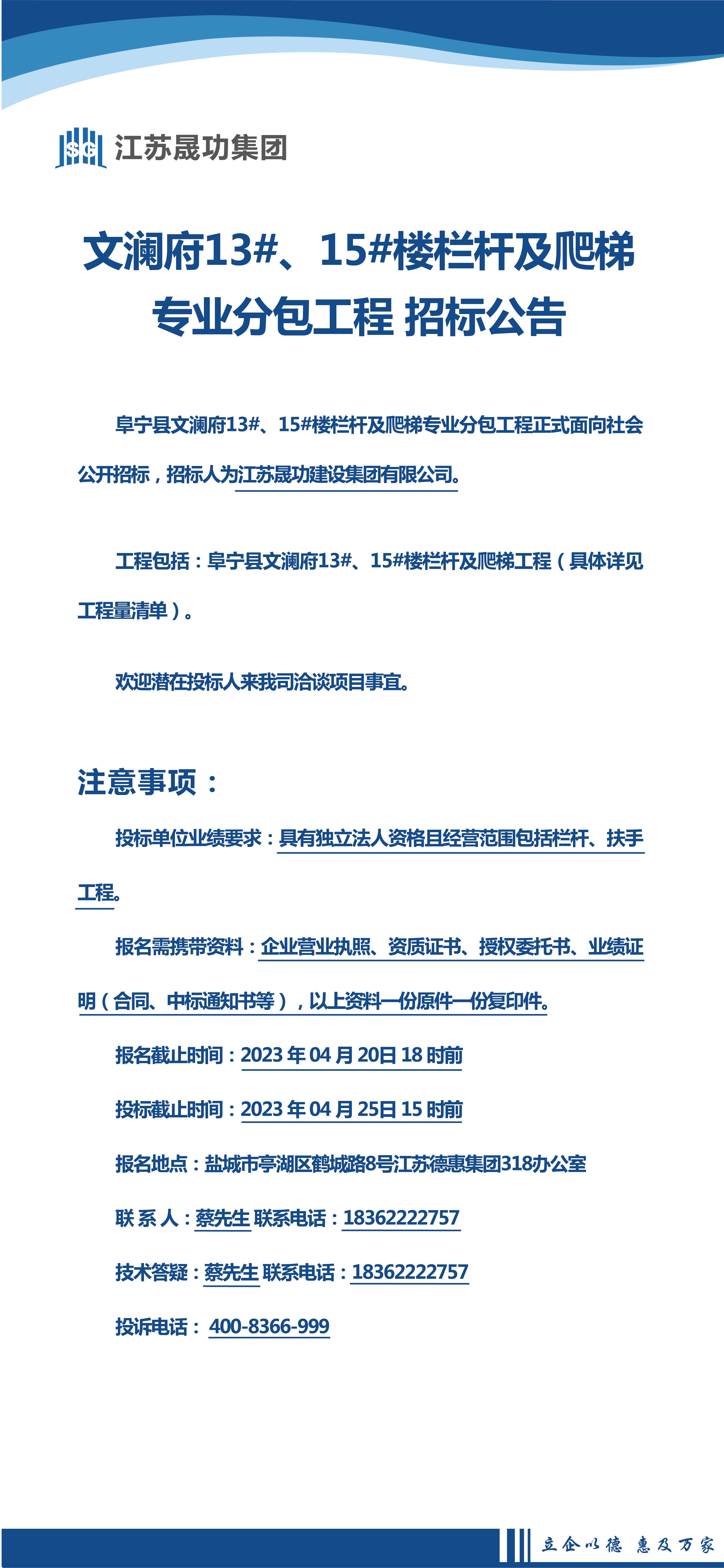 阜寧文瀾府13#、15#樓欄桿、爬梯專業(yè)分包工程