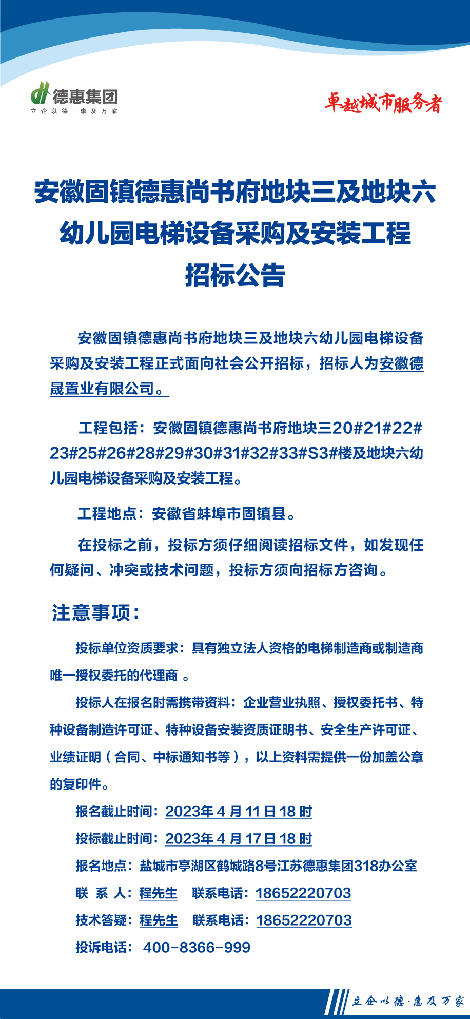 安徽固鎮(zhèn)德惠尚書(shū)府地塊三及地塊六幼兒園電梯設(shè)備采購(gòu)及安裝工程