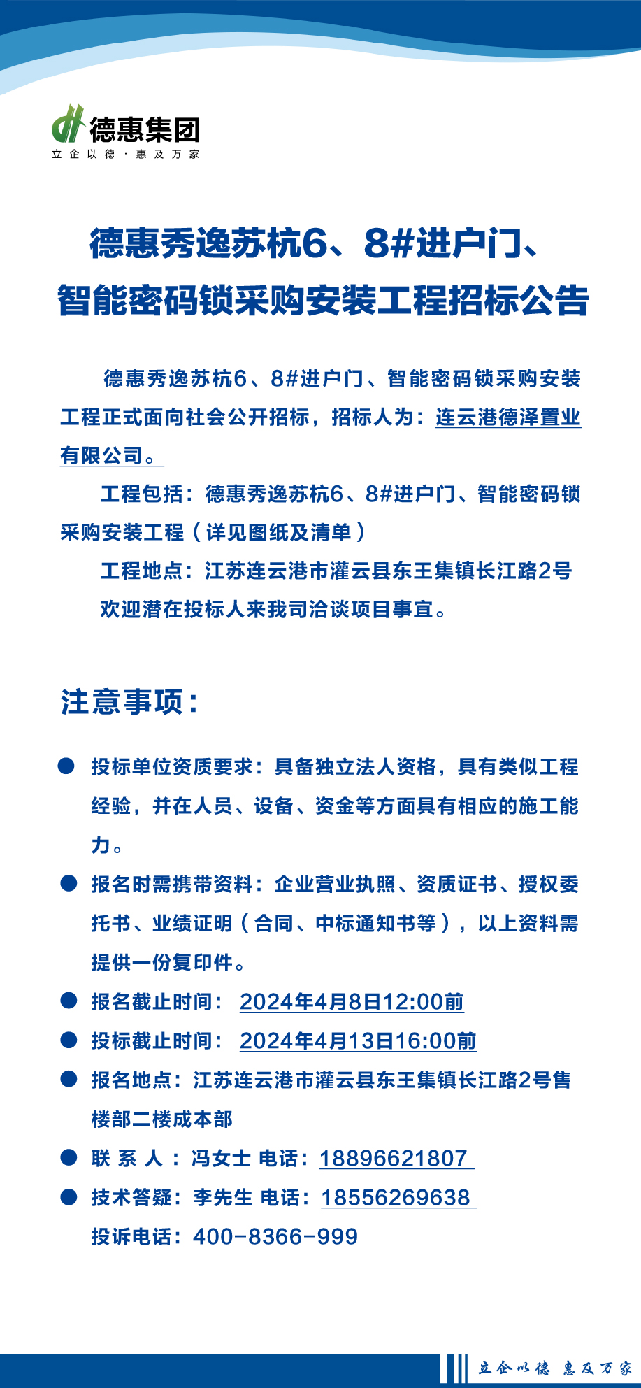 德惠秀逸蘇杭6、8#進(jìn)戶門、智能密碼鎖采購安裝工程