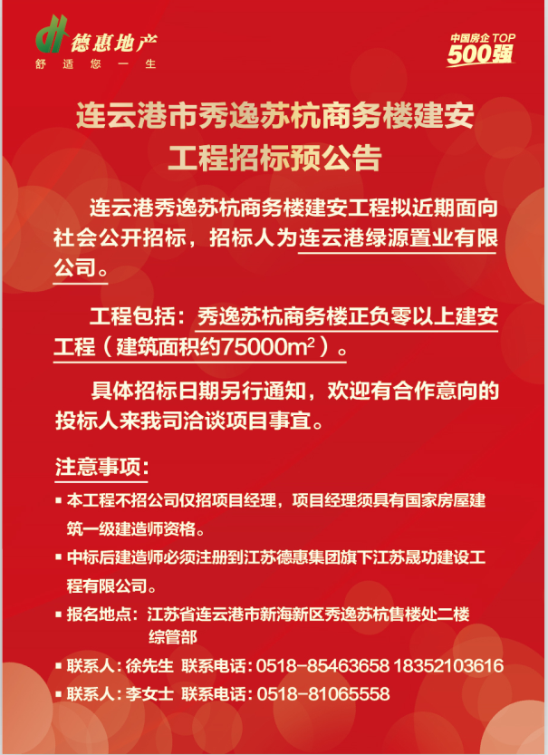 連云港 德惠·秀逸蘇杭商務樓建安工程招標公告
