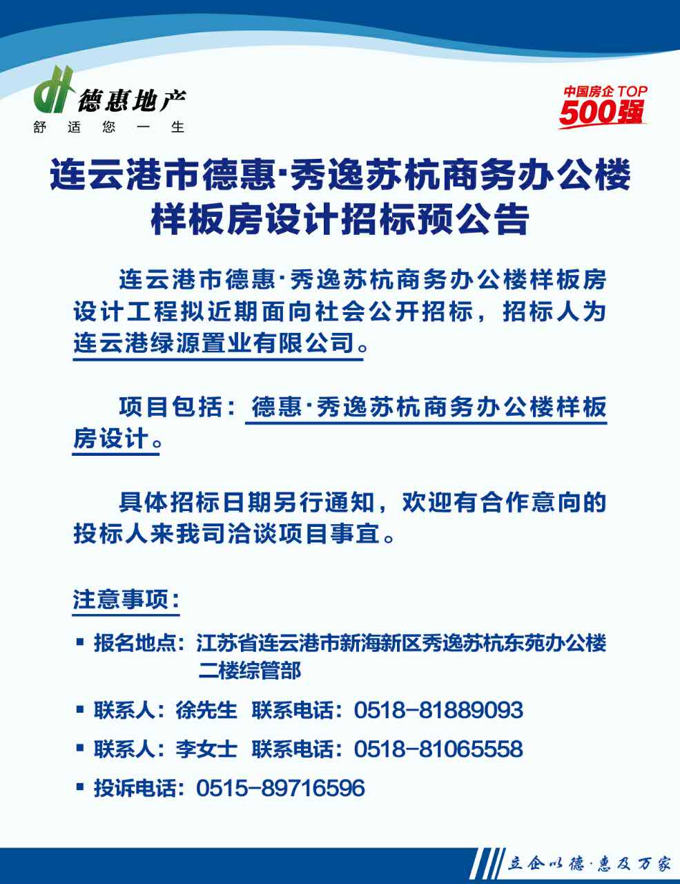 連云港德惠·秀逸蘇杭商務(wù)辦公樓樣板房設(shè)計招標(biāo)預(yù)公告