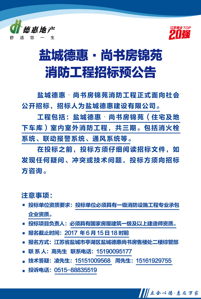 鹽城德惠•尚書(shū)房錦苑消防工程招標(biāo)預(yù)公告