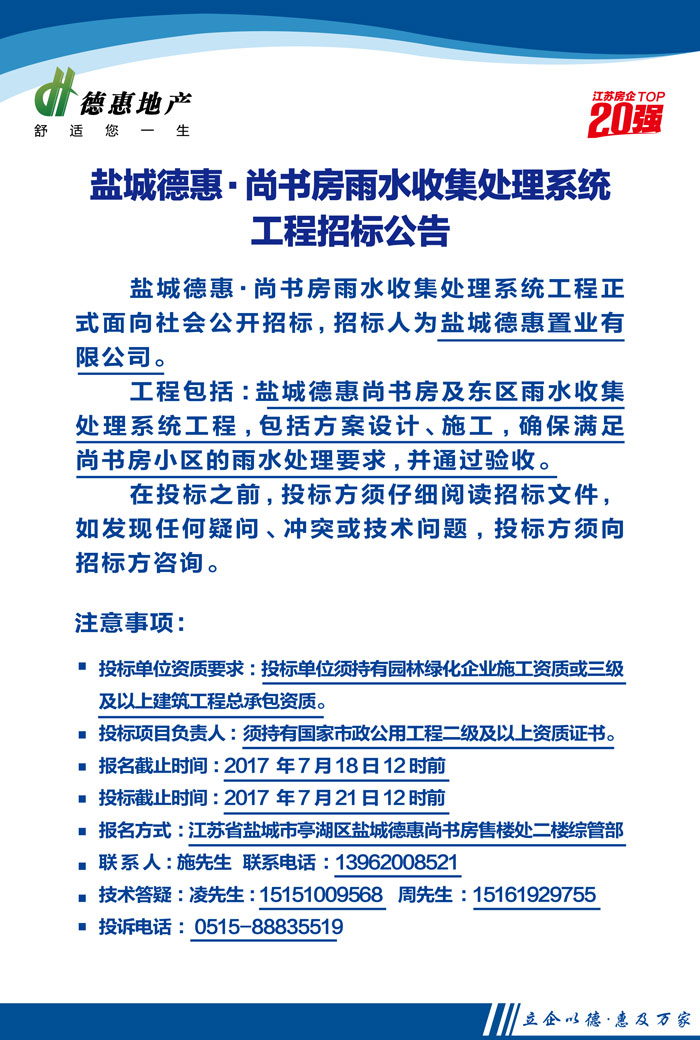 鹽城德惠•尚書房雨水收集處理系統(tǒng)工程招標(biāo)公告