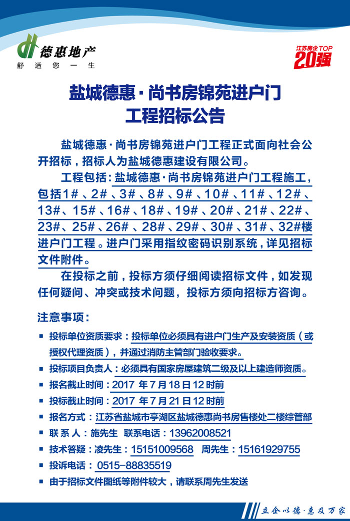 鹽城德惠•尚書房錦苑進戶門工程招標公告