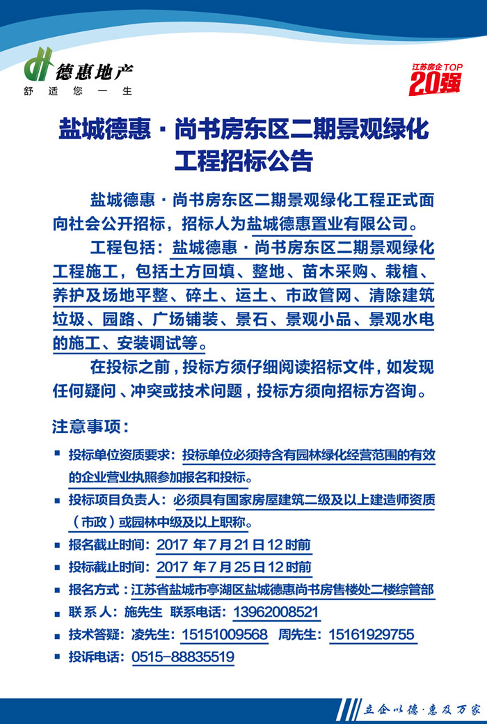 鹽城德惠·尚書房東區(qū)二期景觀綠化工程招標(biāo)公告