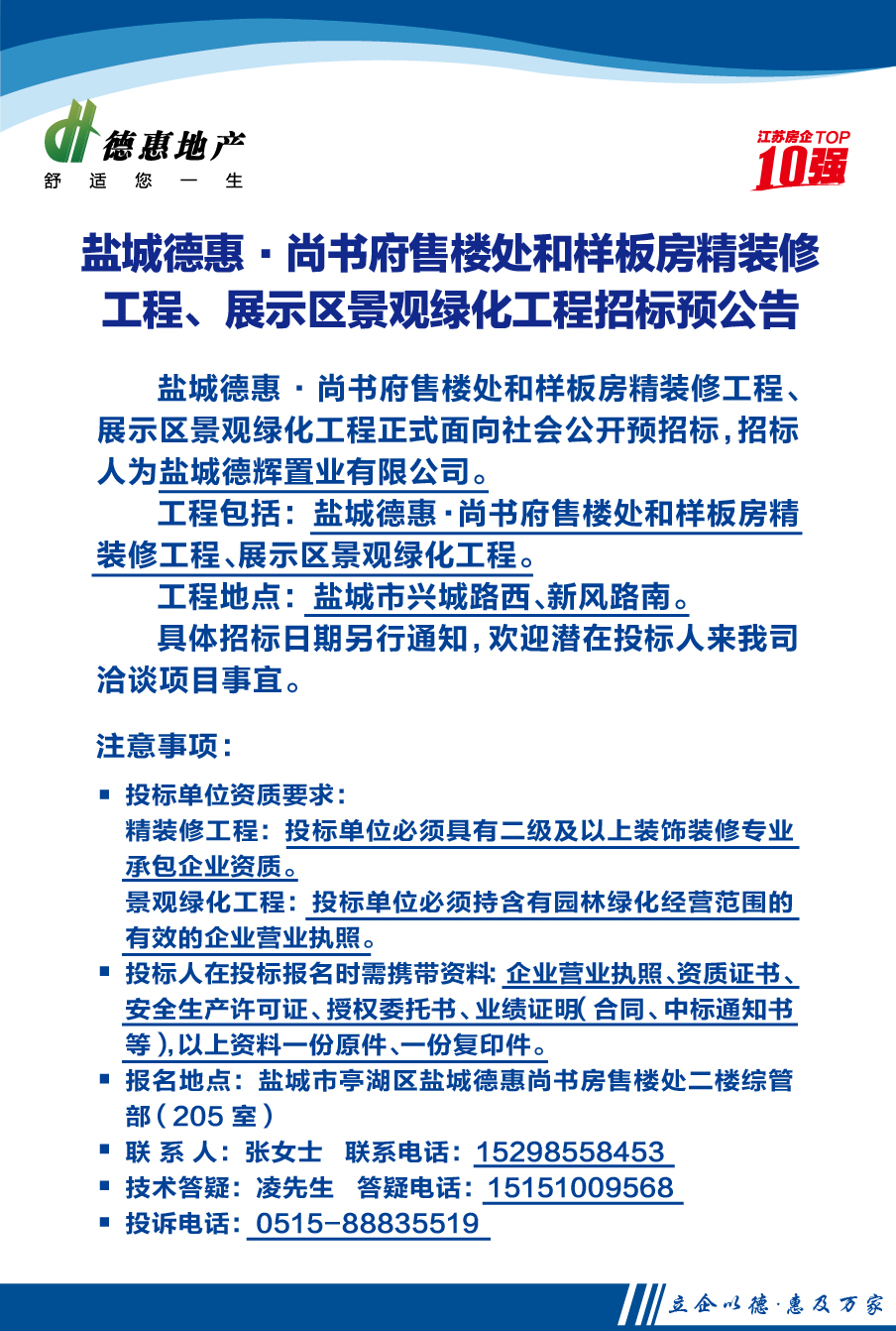 鹽城德惠·尚書府售樓處和樣板房精裝修工程、展示區(qū)景觀綠化工程招標(biāo)預(yù)公告