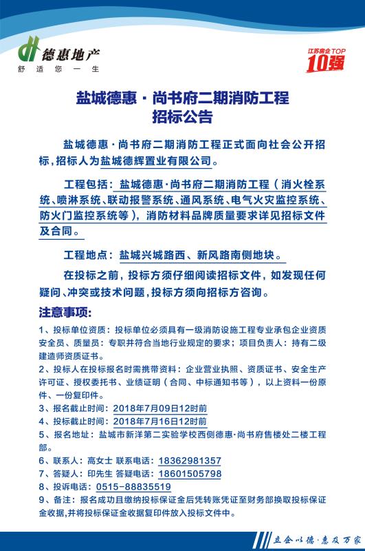 鹽城德惠·尚書府二期消防工程招標(biāo)公告