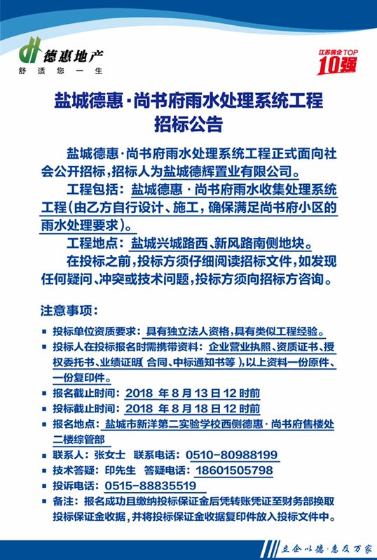 鹽城德惠·尚書(shū)府雨水處理系統(tǒng)工程招標(biāo)公告