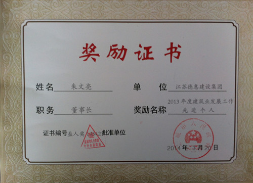 2014年7月23日,江蘇德惠建設(shè)集團董事長朱文亮同志榮獲“2013年度建筑業(yè)發(fā)展工作先進個人”稱號!