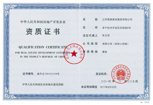 2014年8月25日,江蘇德惠建設(shè)集團(tuán)有限公司榮升全國(guó)房地產(chǎn)開(kāi)發(fā)一級(jí)資質(zhì) |