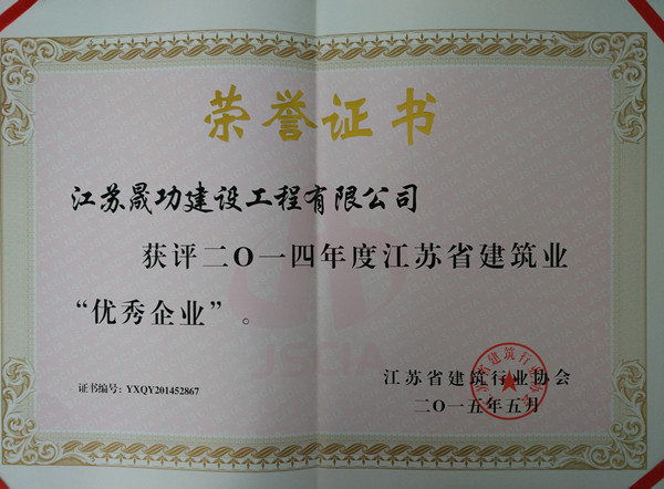2015年7月19日,從鹽城市建筑業(yè)協(xié)會五屆二次會長辦公會議傳來好消息:江蘇晟功建設工程有限公司榮獲“二〇一四年度江蘇省建筑業(yè)優(yōu)秀企業(yè)”稱號,朱文亮同志獲評“二〇一四年度江蘇省建筑業(yè)優(yōu)秀企業(yè)經(jīng)理”。