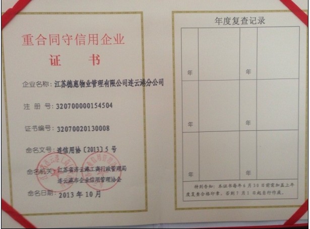 熱烈祝賀江蘇德惠物業(yè)管理有限公司連云港分公司榮獲“重合同 守信用企業(yè)”稱號(hào)!