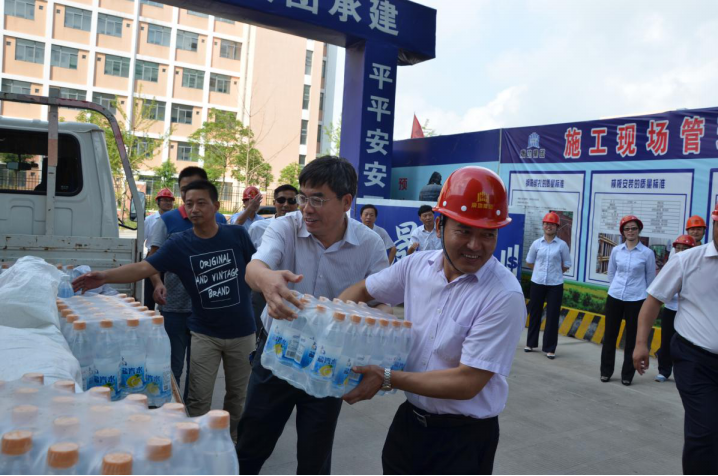 夏日炎炎,驕陽(yáng)似火。8月6日上午8時(shí),阜寧縣總工會(huì)計(jì)俊主席、阜寧縣建管局夏榮森局長(zhǎng)等一行到德惠集團(tuán)尚書府項(xiàng)目工地進(jìn)行了 “送清涼”慰問(wèn)活動(dòng)。 計(jì)主席等人將豬肉、礦泉水、西瓜、綠豆、粉絲等送到了一線工人手中,并與晟功建設(shè)朱文高總經(jīng)理溝通了高溫作業(yè)的相關(guān)情況,要求結(jié)合高溫安全生產(chǎn)工作精神,細(xì)致部署各項(xiàng)防暑降溫工作。 “送清涼”慰問(wèn)活動(dòng)是縣總工會(huì)和縣住建局在高溫時(shí)節(jié)給我集團(tuán)施工一線送來(lái)的關(guān)懷,也給施工一線帶來(lái)了莫大的鼓舞。集團(tuán)全員將上下齊心,戰(zhàn)高溫、促生產(chǎn),以飽滿的激情和超常的干勁投入到工作中去,創(chuàng)造出一個(gè)又一個(gè)耀眼的輝煌。