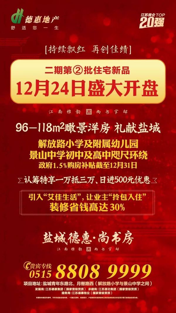 項(xiàng)目過硬的建筑品質(zhì)先后獲得省市各級(jí)政府部門的嘉獎(jiǎng)。2016年2月,鹽城德惠尚書房項(xiàng)目榮獲鹽城市亭湖區(qū)人民政府頒發(fā)的建筑業(yè)工作“創(chuàng)省級(jí)標(biāo)準(zhǔn)化示范工地”獎(jiǎng)項(xiàng)。2016年8月,德惠集團(tuán)晟功建設(shè)與400多家強(qiáng)勁的對(duì)手企業(yè)激烈角逐評(píng)比后,位列鹽城市建筑企業(yè)信用評(píng)價(jià)前四強(qiáng)! 德惠集團(tuán)全體人員未來將再接再厲,持續(xù)狠抓現(xiàn)場(chǎng)文明施工,以優(yōu)質(zhì)的質(zhì)量管理、先進(jìn)的施工技術(shù)為保障,為鹽城父老鄉(xiāng)親打造更多精品之家。 新品開盤在即,火爆認(rèn)籌中 為回饋家鄉(xiāng)父老的厚愛,鹽城德惠·尚書房二期第二批住宅新品將于 12月24日盛大開盤,現(xiàn)正火爆認(rèn)籌中,誠邀父老鄉(xiāng)親蒞臨品鑒!