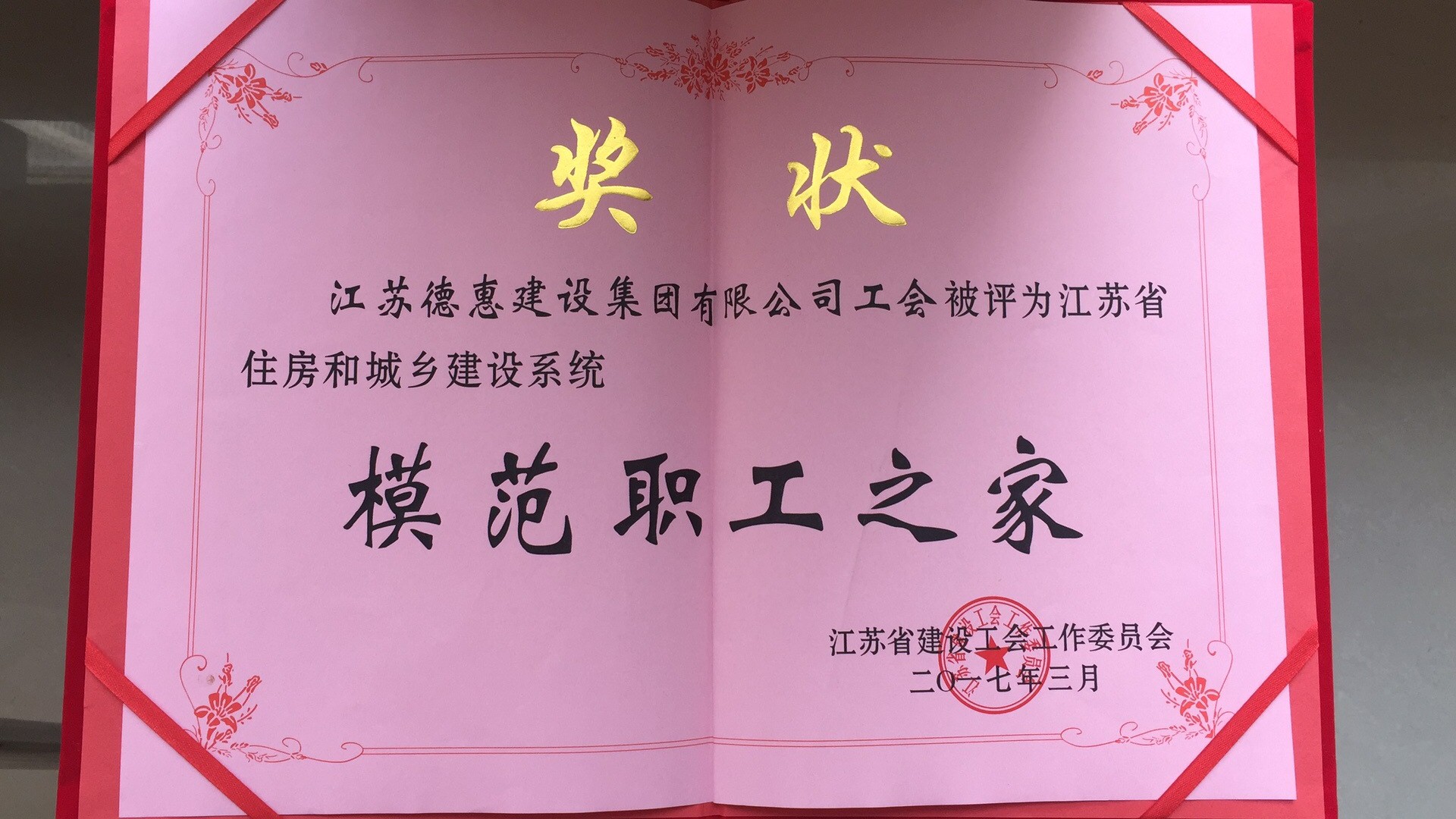 熱烈祝賀江蘇德惠建設(shè)集團(tuán)有限公司工會(huì)被評(píng)為江蘇省住房和城鄉(xiāng)建設(shè)系統(tǒng)“模范職工之家”榮譽(yù)稱號(hào)?。?!