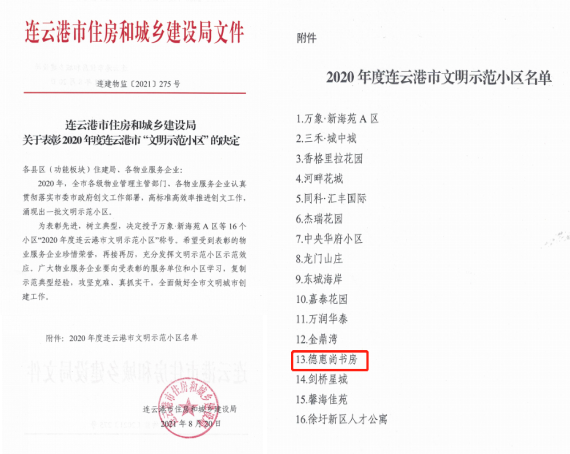 日前,連云港市住房和城鄉(xiāng)建設(shè)局公布了2020年度連云港市“文明示范小區(qū)”表彰決定,江蘇德惠物業(yè)服務(wù)有限公司管理的連云港德惠尚書房小區(qū)榮登榜單。這是德惠尚書房項(xiàng)目繼榮獲“2020年度連云港市市級示范物業(yè)管理項(xiàng)目”榮譽(yù)后,獲得的又一項(xiàng)殊榮,也是德惠物業(yè)今年收獲的第六項(xiàng)榮譽(yù)稱號。