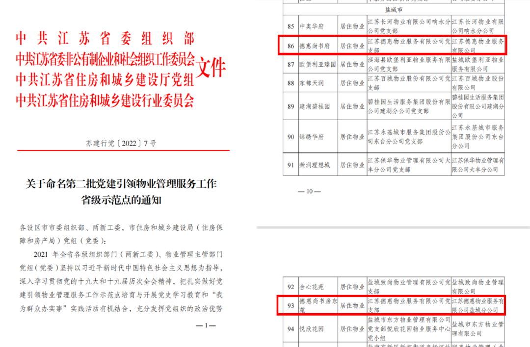 日前,中共江蘇省委組織部、中共江蘇省委非公有制企業(yè)和社會(huì)組織工作委員會(huì)、中共江蘇省住房和城鄉(xiāng)建設(shè)廳黨組、中共江蘇省住房和城鄉(xiāng)建設(shè)行業(yè)委員會(huì)聯(lián)合發(fā)文,公布了“關(guān)于命名第二批黨建引領(lǐng)物業(yè)管理服務(wù)工作省級(jí)示范點(diǎn)的通知”(蘇建行黨【2022】7號(hào))。我司服務(wù)項(xiàng)目阜寧德惠尚書府、鹽城德惠尚書房東苑雙雙入選!