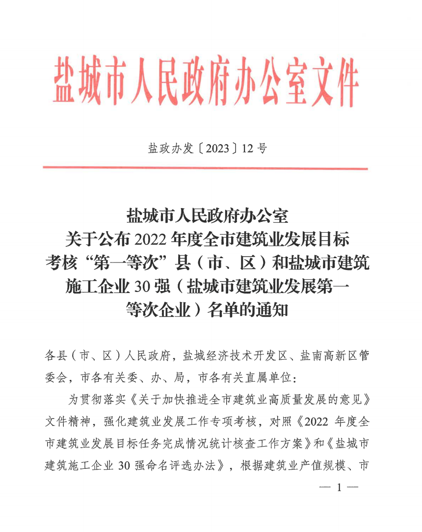 日前,鹽城市人民政府辦公室通報(bào)了《關(guān)于公布2022年度鹽城市建筑業(yè)發(fā)展目標(biāo)考核“第一等次”縣(市、區(qū))和鹽城市建筑施工企業(yè)30強(qiáng)(鹽城市建筑業(yè)發(fā)展第一等次企業(yè))名單的通知》,晟功建設(shè)集團(tuán)榮登鹽城市建筑施工企業(yè)30強(qiáng)榜單,這也是集團(tuán)連續(xù)四年蟬聯(lián)鹽城市建筑業(yè)發(fā)展第一等次榮譽(yù)稱號。