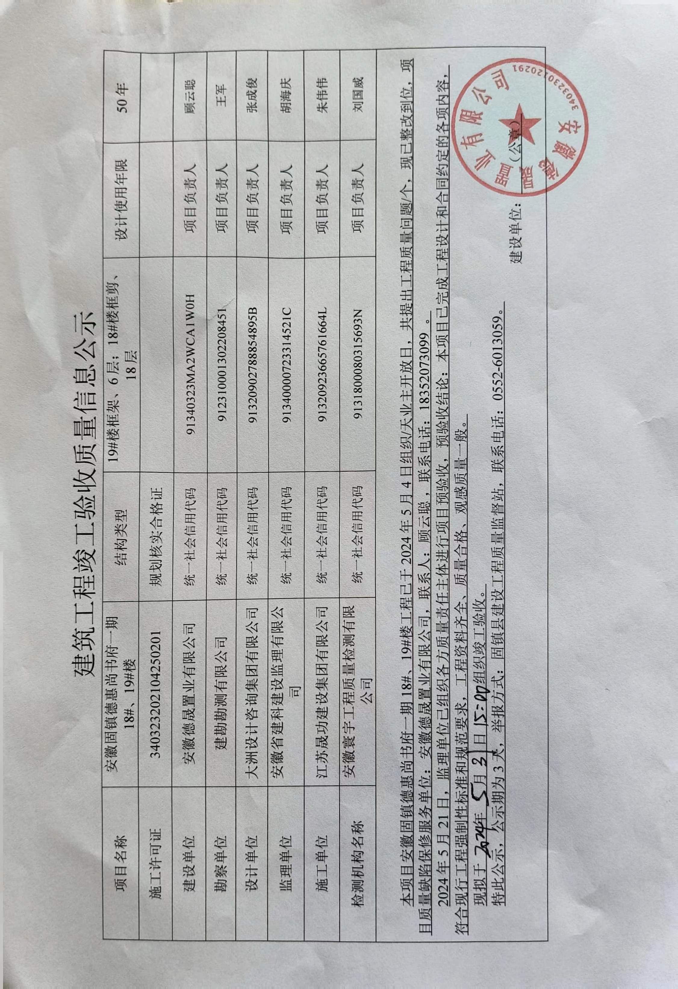 安徽固鎮(zhèn)德惠尚書府一期18#、19#樓建筑工程竣工驗(yàn)收質(zhì)量信息公示