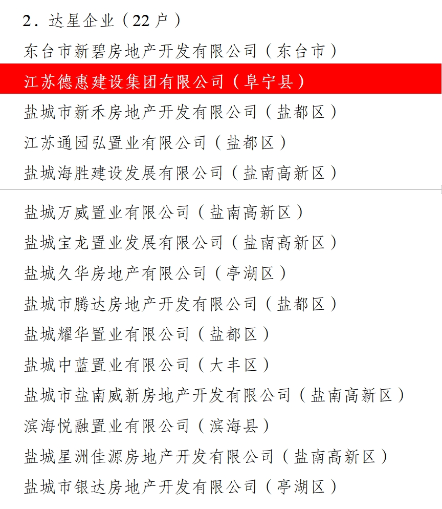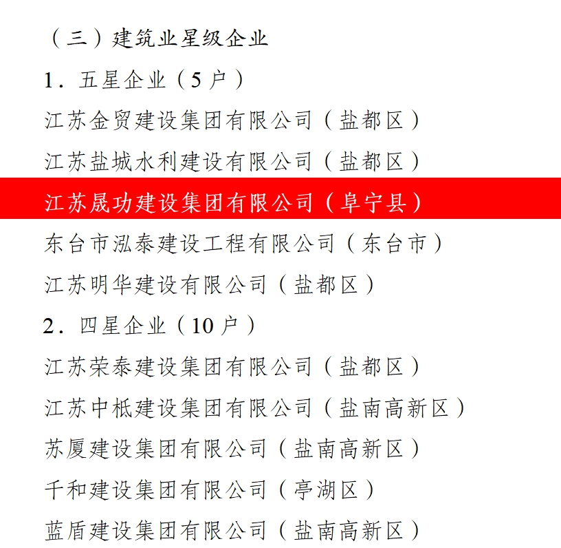 近日,中共鹽城市委辦公室公布了鹽城市2024年度星級企業(yè)認定名單,江蘇晟功建設集團有限公司獲評江蘇省鹽城市“爭星創(chuàng)優(yōu)”建筑業(yè)五星企業(yè)認定;江蘇德惠建設集團有限公司獲評房地產“達星企業(yè)”認定。